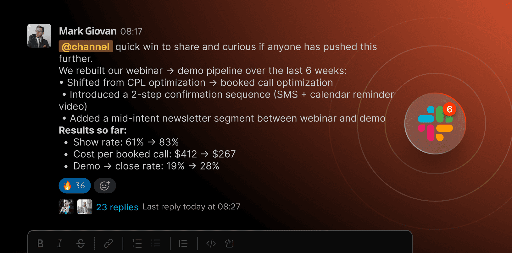 $6M+ generated via webinars and email in 2023. Drives demand across four companies through funnels and campaign execution. Same systems applied inside GTM-OS.